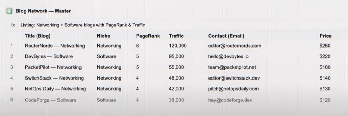 So he hacked together a solution: a single Google Sheet listing hundreds of blogs with traffic data, page rank, and categories.